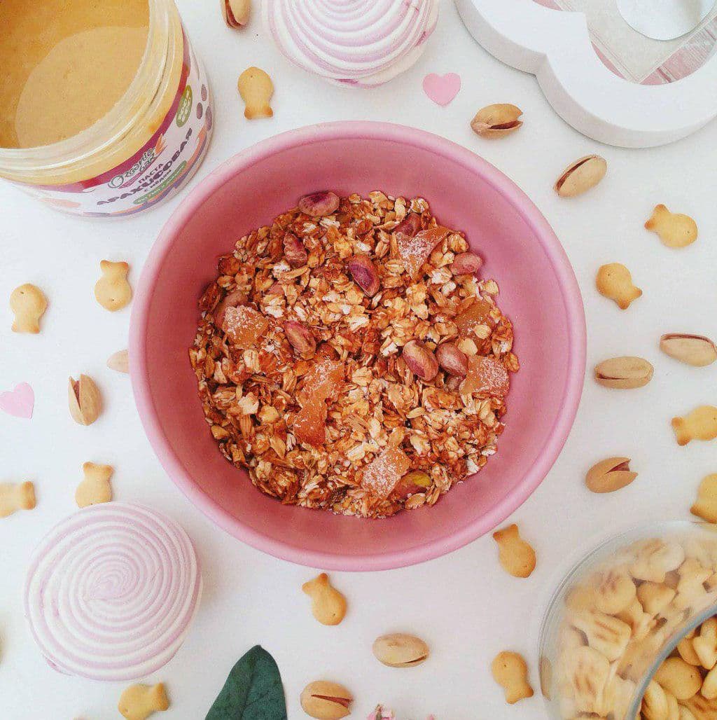 ☺ 100% натуральный состав: геркулес, запеченный с медом или фруктовым пюре, орехи, сухофрукты, семена, пряности, иногда шоколад или цукаты
